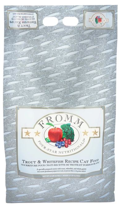 We feed Fromm's Four-Star Nutritionals dry cat food, a high-quality recipe made with trout, whitefish, and whole grains. This nutrient-rich formula supports all breeds and life stages, ensuring our Maine Coons get the balanced diet they need. Plus, the interchangeable recipes keep mealtime exciting!